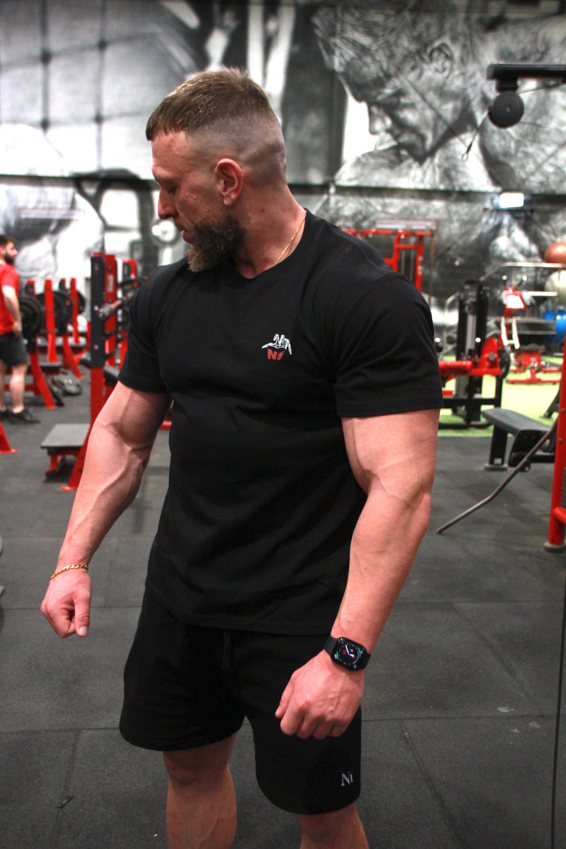 - Screen-printed skeletal hand & Ní logo